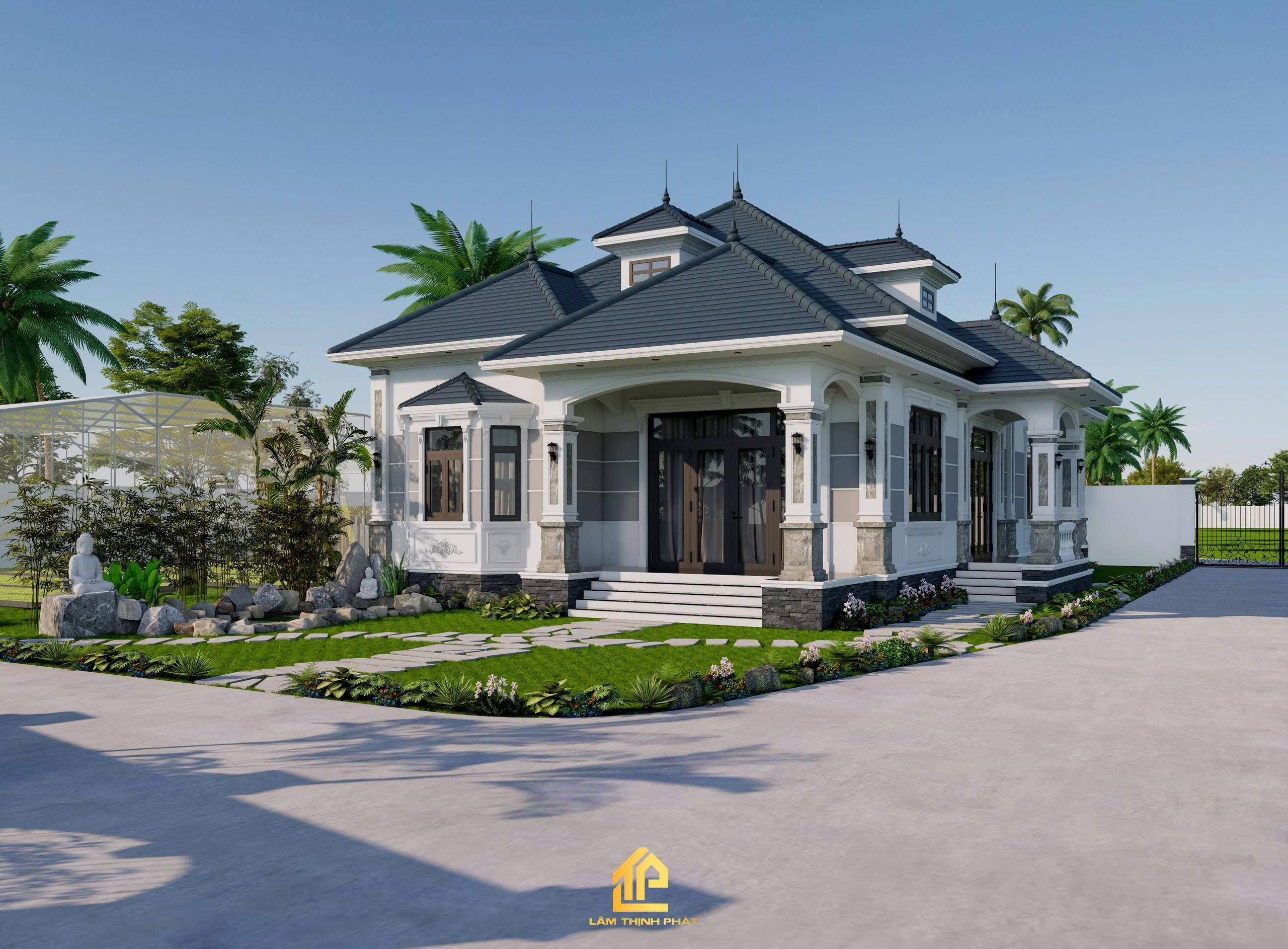 Khuôn viên rộng rãi với hệ thống cây xanh, lối đi đá uốn lượn và bãi cỏ mướt mắt giúp gia chủ tận hưởng trọn vẹn sự thư thái mỗi ngày.